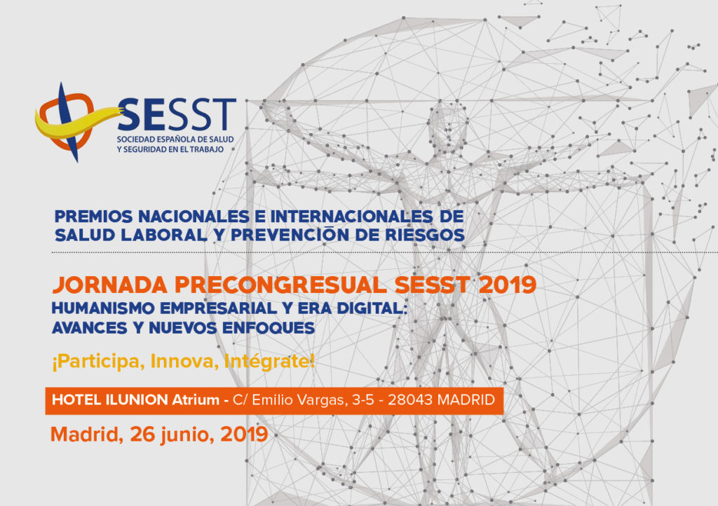 El próximo 26 de junio, en el Hotel Ilunion Atrium, de Madrid, se celebrará Jornada PRECONGRESUAL SESST 2019, que organiza la Sociedad Española de Salud y Seguridad en el Trabajo (SESST) bajo el lema: «HUMANISMO EMPRESARIAL Y ERA DIGITAL: AVANCES Y NUEVOS ENFOQUES»