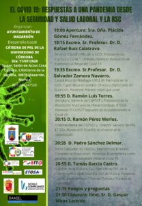 El pasado viernes, 17 de julio, se celebró en el municipio murciano de Mazarrón una jornada organizada por Concejalía de Desarrollo Local del Ayuntamiento de Mazarrón junto con la Cátedra de PRL y Salud Pública de la Universidad de Córdoba, que llevó por título “Covid-19. Respuestas a una pandemia desde la seguridad y salud laboral y la responsabilidad social corporativa”.